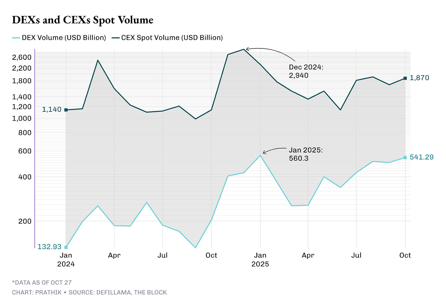 بلغ متوسط حجم التداول الشهري للبورصات اللامركزية في الربع الأول من 2025 حوالي 395 مليار دولار، ثم 332 مليار دولار في الربع الثاني، وفي الربع الثالث ارتفع المتوسط بنسبة 50% ليصل إلى 480 مليار دولار شهرياً. وفي أكتوبر، تجاوز الحجم بالفعل 540 مليار دولار مع تبقي أربعة أيام على نهاية الشهر.