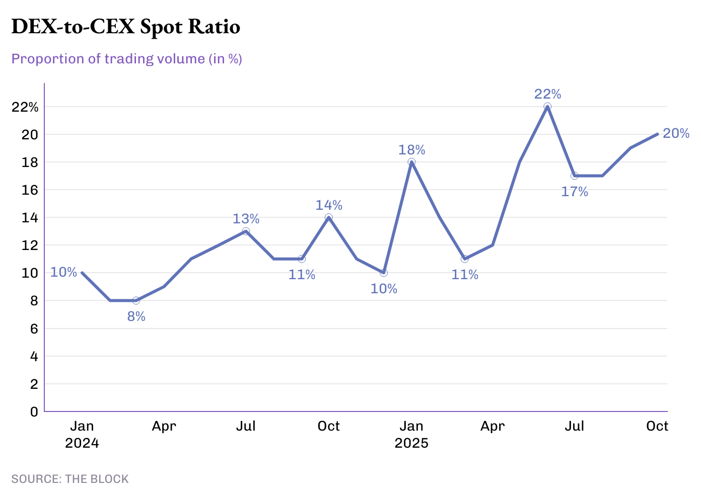 حتى الآن هذا العام، شكلت DEXs قرابة 20% من إجمالي حجم التداول الفوري، بعد أن كانت تشكل أكثر قليلاً من 10% في 2024. ورغم استمرار سيطرة CEXs على السوق بفضل مسارات العملات الورقية، أصبحت DEXs الخيار المفضل لمن يبحثون عن السرعة، وقابلية التركيب، والخصوصية، وحفظ الأصول الذاتي.