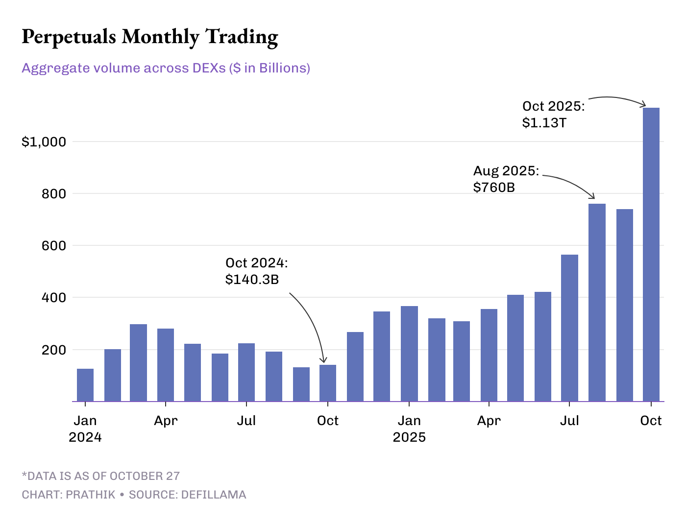 غير عام 2025 وتيرة النمو، إذ ارتفع متوسط حجم التداول الشهري للعقود الدائمة من 332 مليار دولار في الربع الأول إلى أكثر من ضعف ذلك في الربع الثالث، ليبلغ 688 مليار دولار. وفي أكتوبر وحده، تجاوز حجم التداول 1.13 تريليون دولار، وهو أول شهر تتجاوز فيه المشتقات على البلوكتشين حاجز التريليون، أي أكثر من ضعف حجم السوق الفوري للبورصات اللامركزية.