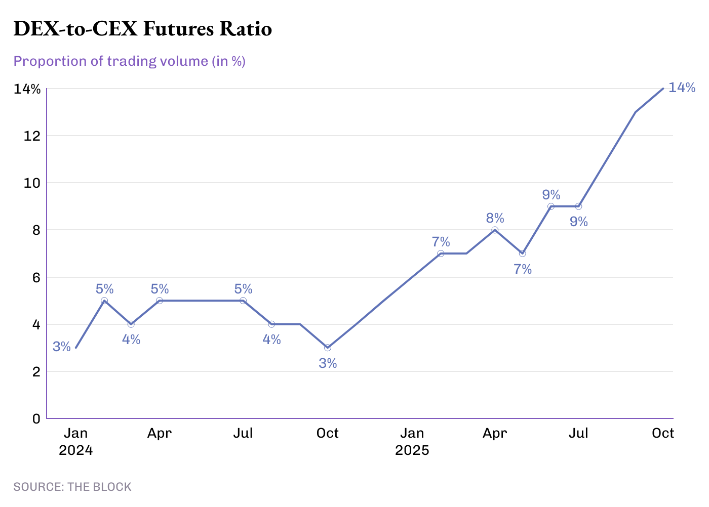 في 2024، لم تتجاوز حصة العقود الدائمة اللامركزية 5% من حجم العقود المستقبلية العالمي. وبمنتصف 2025، تضاعفت النسبة إلى 10%، ثم وصلت في أكتوبر إلى 14.3%، وهي أعلى نسبة للمشتقات على البلوكتشين مقارنة بالبورصات المركزية.
