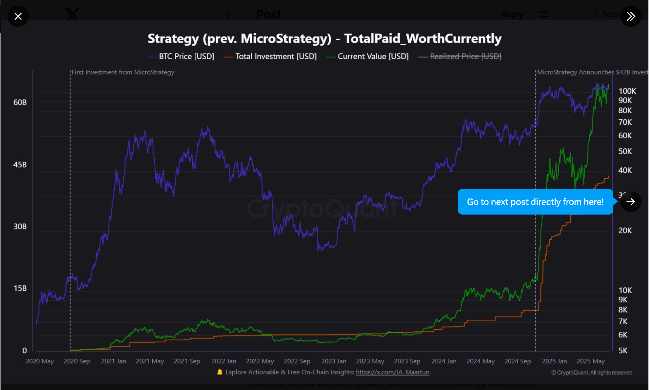 صرحت CryptoQuant في منشور لها على X أنه اعتبارًا من 30 يونيو 2025، فإن عملاق الذكاء التجاري Strategy (، والذي كان يعرف سابقًا باسم MicroStrategy)، يمتلك عددًا مذهلاً من 597,000 عملة بيتكوين(BTC). تكلفة شراء هذه العملات كانت 42.4 مليار دولار، وبسعر السوق الحالي تصل قيمتها إلى 64.4 مليار دولار، مما يعني أرباحًا غير محققة ضخمة.