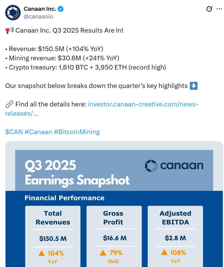 المصدر:كانانلقد أفاد عمال المناجم الآخرون أيضًا بتقارير عن أرباح قوية. أفادت شركة HIVE Digital بزيادة في الأرباح بنسبة 285% يوم الاثنين، بينما تضاعف إيرادات BitFuFu في الربع الثالث نتيجة لزيادة الطلب على التعدين السحابي والمعدات حيث سعى عمال المناجم للاستفادة من الزيادة في سعر بيتكوين (BTC).