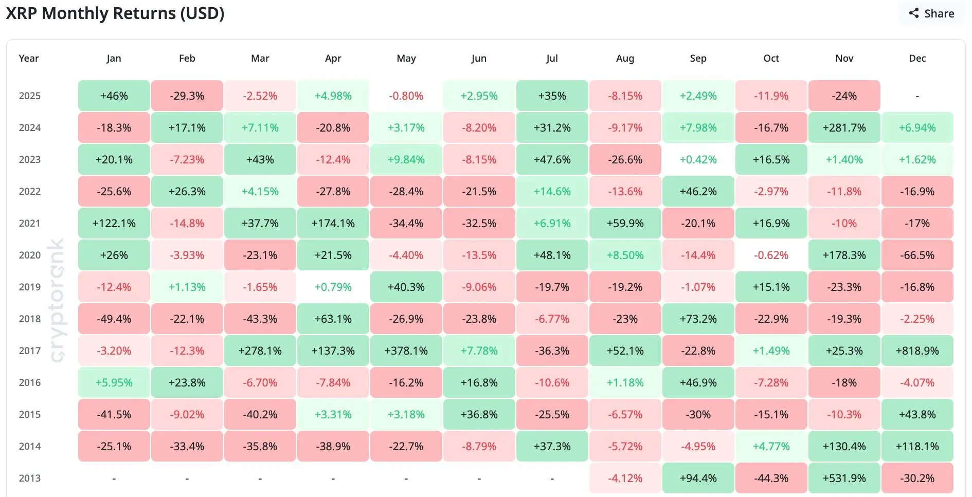ومع ذلك، لا يزال هناك مجال للتفاؤل. تشير تاريخ أسعار XRP إلى مفاجأة في نهاية العام: عائد متوسط قدره 69% في ديسمبر.