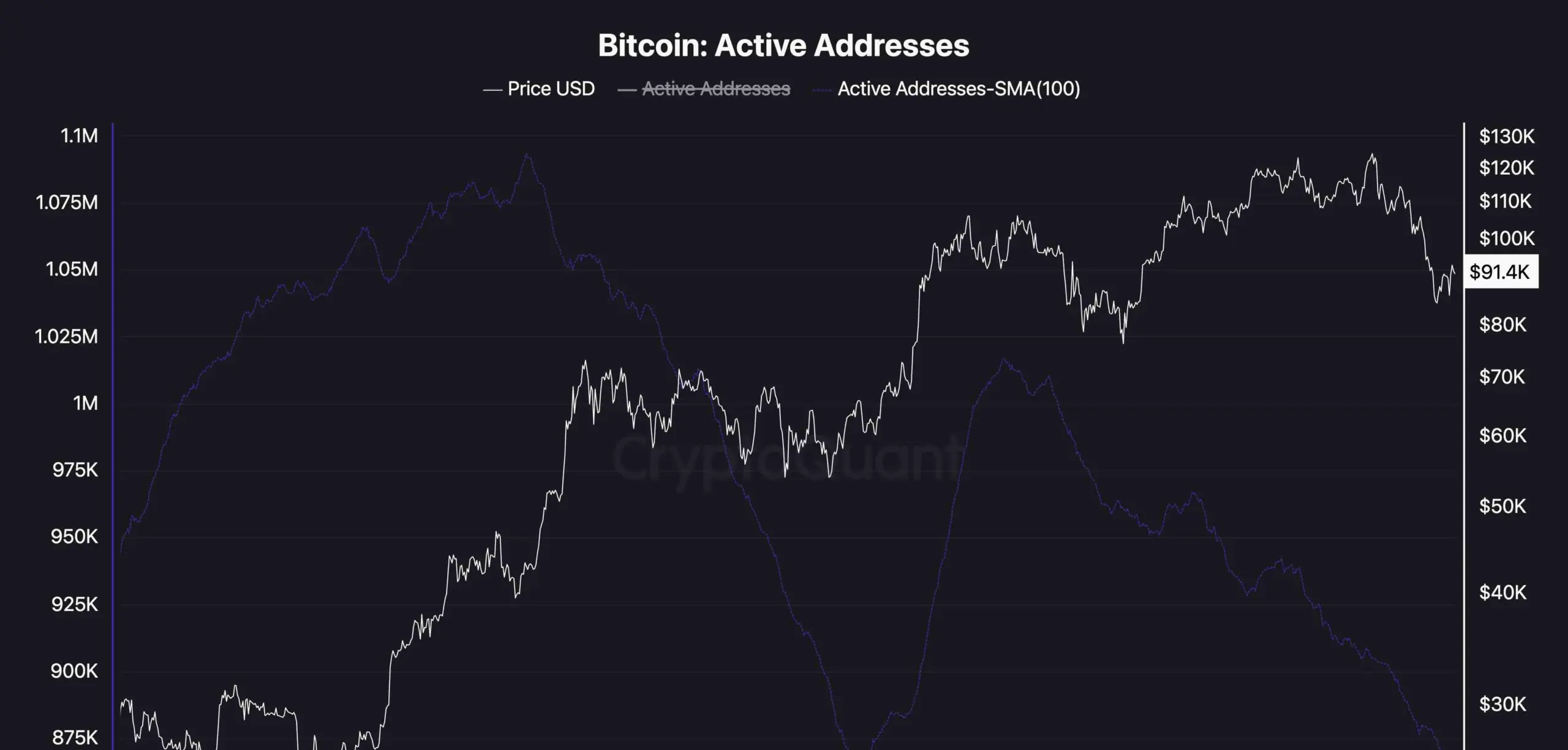 الصورة على السلسلة لا تساعد المستثمرين كثيرًا في الوقت الحالي. فقد انخفضت العناوين النشطة للبيتكوين تدريجيًا منذ فبراير 2025، حتى مع وصول السعر إلى مستويات قياسية جديدة. وقد انعكس هذا التباين أخيرًا خلال الهبوط الحاد في أكتوبر ونوفمبر.