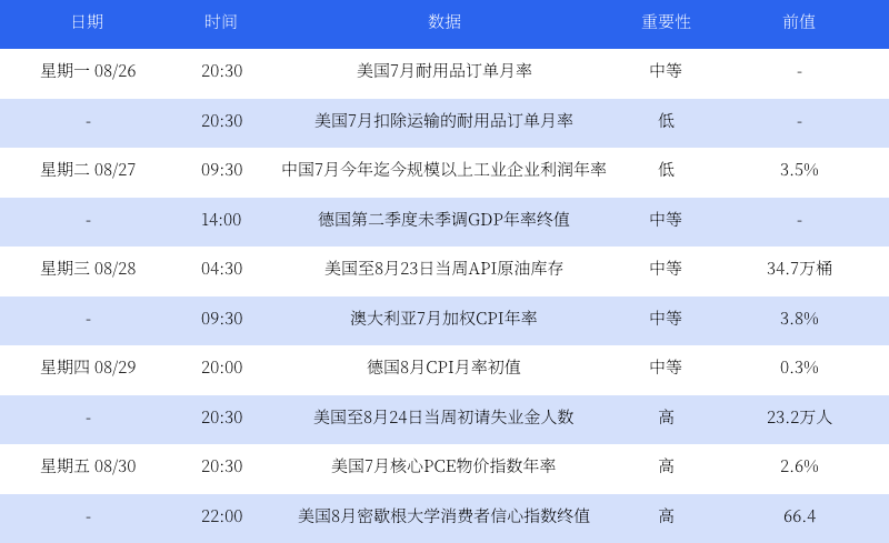 Esta semana se darán a conocer varios datos económicos importantes, incluyendo las órdenes de bienes duraderos de julio en Estados Unidos, el valor final del PIB del segundo trimestre en Alemania, el inventario de crudo API en Estados Unidos, y la tasa anual de IPC de julio en Australia. Entre ellos, el índice de precios al consumo básico anual de julio y el valor final del índice de confianza del consumidor de la Universidad de Michigan de agosto en Estados Unidos son los datos de alta importancia más seguidos, que afectarán las expectativas de un aumento de tasas en septiembre por parte de la Reserva Federal. El valor inicial del IPC de agosto en Alemania y el número inicial de solicitantes de subsidio por desempleo en Estados Unidos también serán seguidos de cerca por el mercado. Además, los datos de beneficios de las empresas industriales en China reflejarán la situación económica interna. Los inversores deben seguir de cerca los datos mencionados anteriormente para comprender las tendencias del mercado.