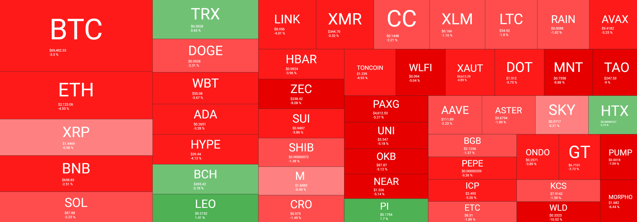 Hoy, el precio cayó aún más y actualmente cotiza en la franja de los $69,000. La mayoría de las altcoins también sufrieron, como puede verse en el mapa de calor de abajo.