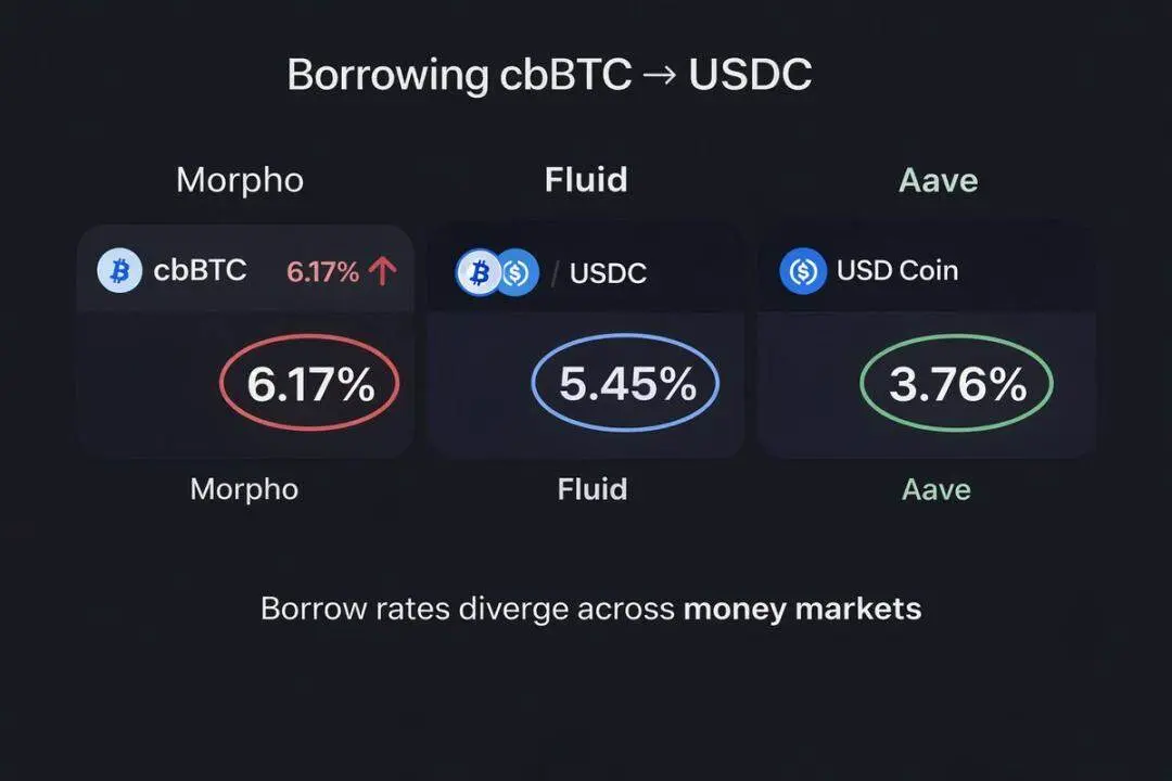Le cas de Coinbase en est la parfaite illustration : les utilisateurs peuvent emprunter des USDC en utilisant leur Bitcoin (cbBTC) comme garantie sur leur plateforme, et ce flux de transactions est dirigé vers le marché de prêt Morpho sur la chaîne Base. Bien que Aave et Fluid sur la chaîne Base offrent des taux nettement plus avantageux pour le prêt de cbBTC contre des stablecoins, Morpho domine toujours le marché. La raison est simple : les utilisateurs de Coinbase sont prêts à payer un coût supplémentaire pour la « commodité immédiate » de l’opération.