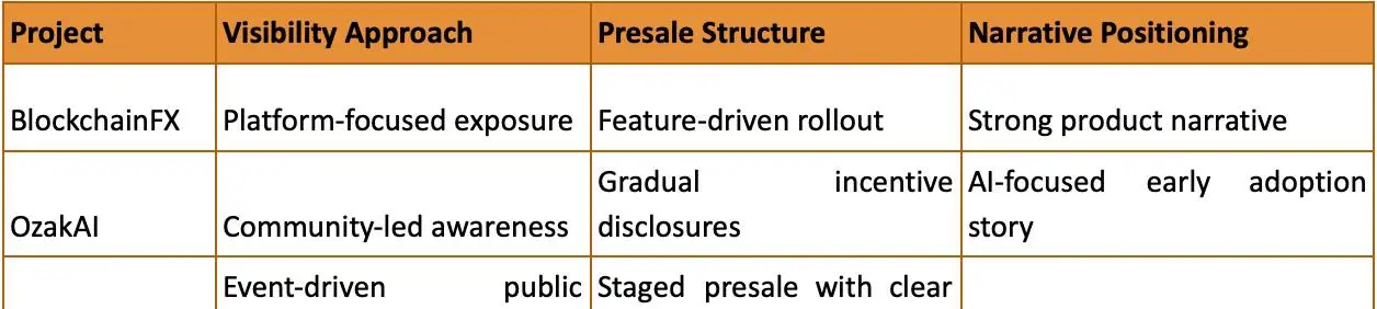Analisis presale paling berguna saat dilihat secara komparatif. Berbagai proyek menekankan proposisi nilai yang berbeda: