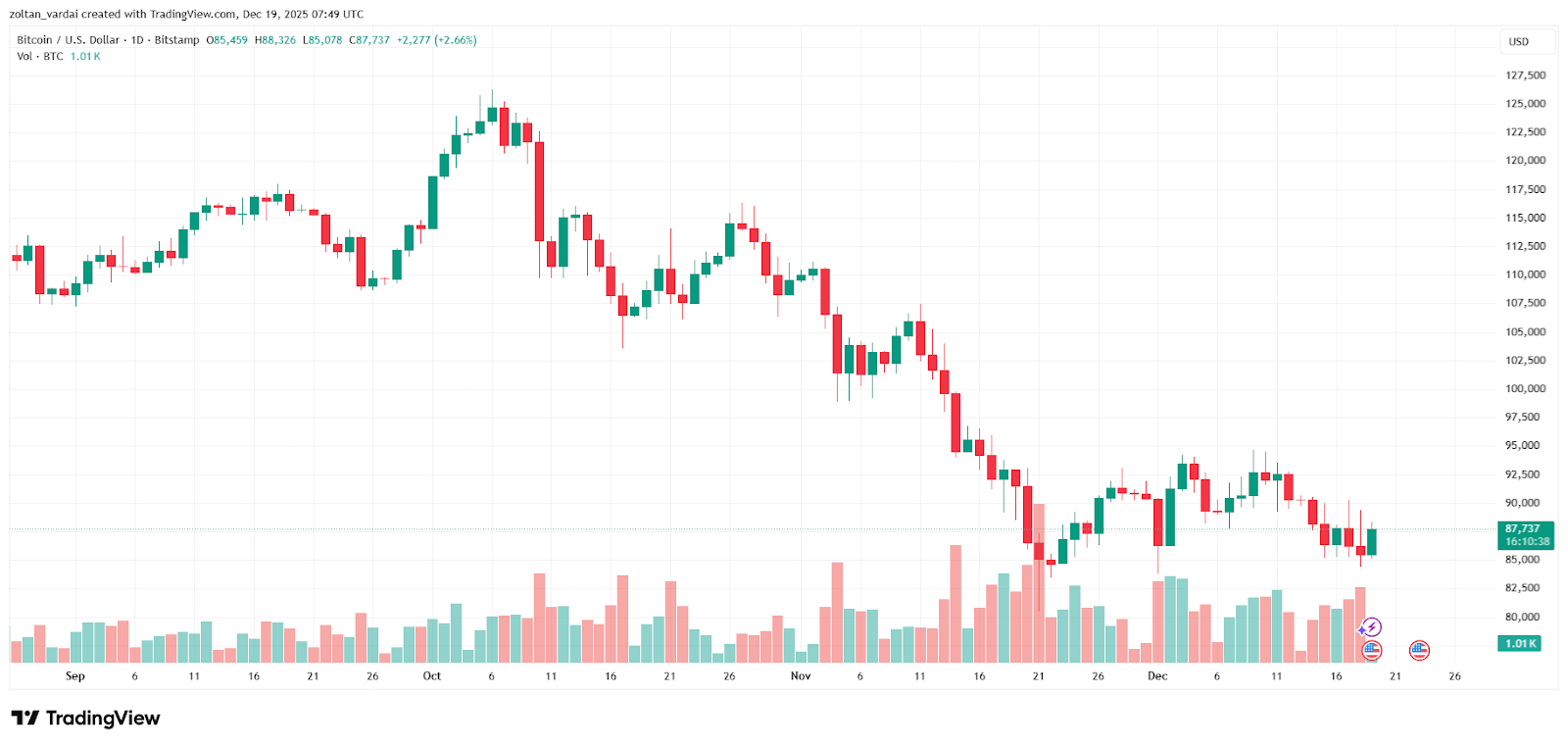 ビットコイン (BTC) は過去一週間で5%以上下落し、木曜日には$84,398の週次安値をつけ、その後金曜日には$87,769を上回って取引されているとTradingViewのデータは示しています。