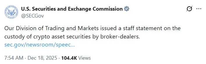 同部門は、ブローカー・ディーラーが既存の顧客保護規則の下で暗号資産証券を所持しているとみなすことに異議を唱えないと述べました。ただし、運用、セキュリティ、ガバナンスの一連の条件を満たす必要があります。これは、トークン化された株式や債券を含む暗号証券にのみ適用されます。