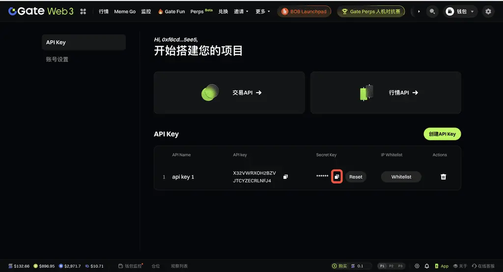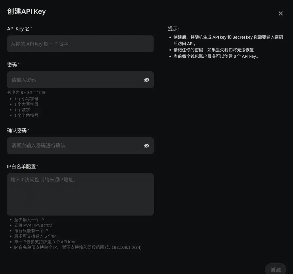 「確認作成」 をクリックすると、システムが新しいAPIキーを生成します。 各アカウントは最大で3つのAPIキーを作成できます。パスワードとキー情報を適切に保管してください—パスワードを失った場合、Secret Keyを復元することはできません。