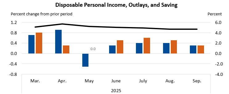 出典: ETHNews原題: 米国の個人所得、9月に増加 消費は減速し貯蓄率は4.7%を維持元リンク: https://www.ethnews.com/u-s-personal-income-rises-in-september-as-spending-slows-and-saving-rate-holds-at-4-7/米商務省経済分析局が発表した新たなデータによると、米国の個人所得は2025年9月も引き続き増加したが、個人消費は減速の兆しを見せた。個人所得は(0.4%)増の945億ドルとなり、主に雇用者報酬の増加と金融資産からの所得増が牽引した。可処分個人所得((DPI))は759億ドル((0.3%)増)上昇し、個人消費支出((PCE))は651億ドル((0.3%)増)となった。今月の消費増加はサービス分野に集中し、サービスは630億ドル増加した一方、財の消費増加はわずか21億ドルにとどまった。個人支出(消費、利子支払い、移転支払いを含む)は707億ドル増加し、個人貯蓄総額は1兆900億ドルとなった。全体の個人貯蓄率は4.7%で横ばいを維持し、第4四半期に向けて消費者の慎重な姿勢が浮き彫りとなった。## 所得の堅調さと実質消費の横ばい名目所得は増加したものの、インフレ調整後の指標は消費環境の軟化を反映している。* 実質可処分個人所得は0.1%増加* 実質個人消費支出は0.0%(横ばい)これは9月の名目消費増加分のほぼ全てがインフレに吸収されたことを示している。## インフレは加速もピーク下回る水準米連邦準備制度理事会(FRB)が重視するインフレ指標であるPCE価格指数は9月に0.3%上昇。食品とエネルギーを除いたコアPCEは0.2%上昇となった。前年比では、総合・コアともに2.8%上昇し、以前の高水準から緩やかな減速傾向が続くものの、FRBの2%目標は依然上回っている。## 9月の主な月次変化まとめ* 個人所得:+0.4%* 可処分個人所得:+0.3%* 実質可処分所得:+0.1%* 個人消費支出:+0.3%* 実質個人消費支出:0.0%* PCE価格指数:+0.3%* コアPCE:+0.2%
