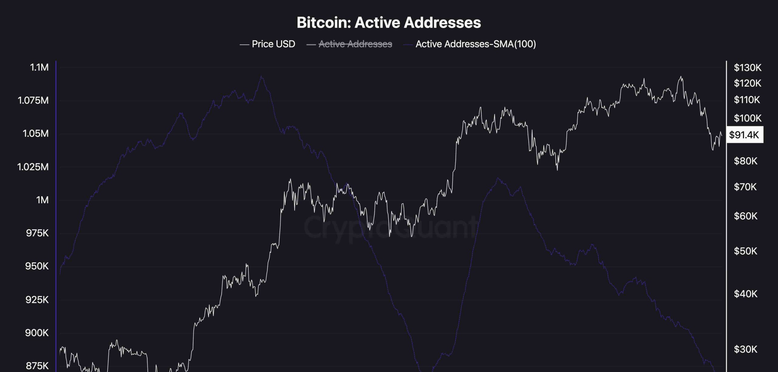 現在、価格が80kから91kに反発したにもかかわらず、アクティブアドレス数(100日SMAで測定)は引き続き減少し、直近では875kを下回っています。これは、小口や一般ユーザーの活動が依然として縮小しており、この上昇が一部の大口参加者や機関投資家によって推進されている可能性を示唆しています。