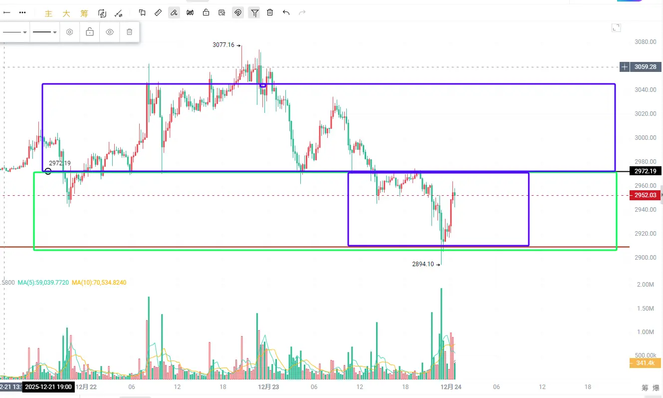 クリスマスウィークに入り、金と銀が共に歴史的な最高値を更新し、アメリカ株式市場も笑顔を見せていますが、暗号通貨はリズムが遅れ、もじもじしており、かなり寂しい状況と言えます。ビットコインは今年のクリスマス相場の恩恵を受けることができるのでしょうか?昨日の参考戦略で示した主な考え方は、やはり高空であり、上方で注目すべき3070ラインは頭ポジションのショートエントリー位置です。オンチェーンの清算について話しましたが、大きなビットコインのアドレス数が大幅に減少しており、短期的な弱気感情がかなり良く解放されたことを示しています。ETHを増持しているファンドもこの数日で増加しており、ビットコインとイーサリアムは今週、良い反発を迎える可能性があります。ただし、金とアメリカ株の新高値が多くの注目と流動性を引き寄せているため、暗号市場はそれほど目立っていないように思えます。しかし、クリスマス相場は必ずあると思います。大きな利益は得られないかもしれませんが、少しは恩恵を受けることができるでしょう。図1はクリスマス休暇のもので、あの時に「トミー今日はなぜ市場を開かなかったのか」と質問しないでください。