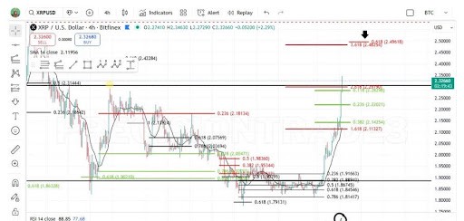 XRPのWave 3は力強いブレイクアウトを見せ、2.618フィボナッチエクステンションを超え、マクロ抵抗線の$2.30をクリアしました。この動きは強いRSIの読みとともにあり、勢いの強さを示しています。