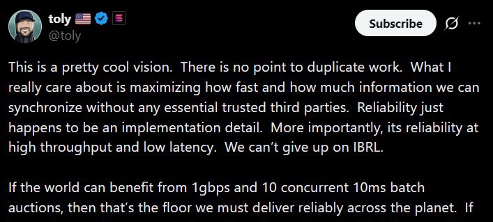Yakovenkoにとって、レジリエンスは、信頼できる仲介者に頼ることなく、高スループットと低遅延で大量の情報を世界中で同期させる能力から生まれます。彼の枠組みでは、信頼性はパフォーマンスと切り離せないものであり、哲学的なトレードオフではありません。