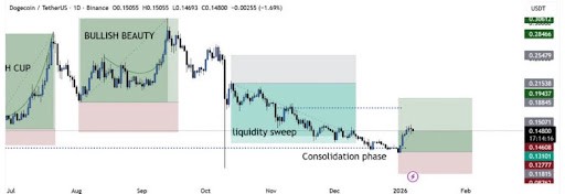 Bitguruは、Dogecoinのチャートは2025年11月から12月にかけて売り側の流動性をクリアした後、価格の安定を示しており、これにより弱いホルダーが排除され、蓄積の基盤が形成されたと説明しました。2026年に続くこの統合は、ボラティリティの低下と安定した基盤構築を示しており、アナリストはこれらがDogecoinの次の大きな価格動きの前に必要な条件だと考えています。