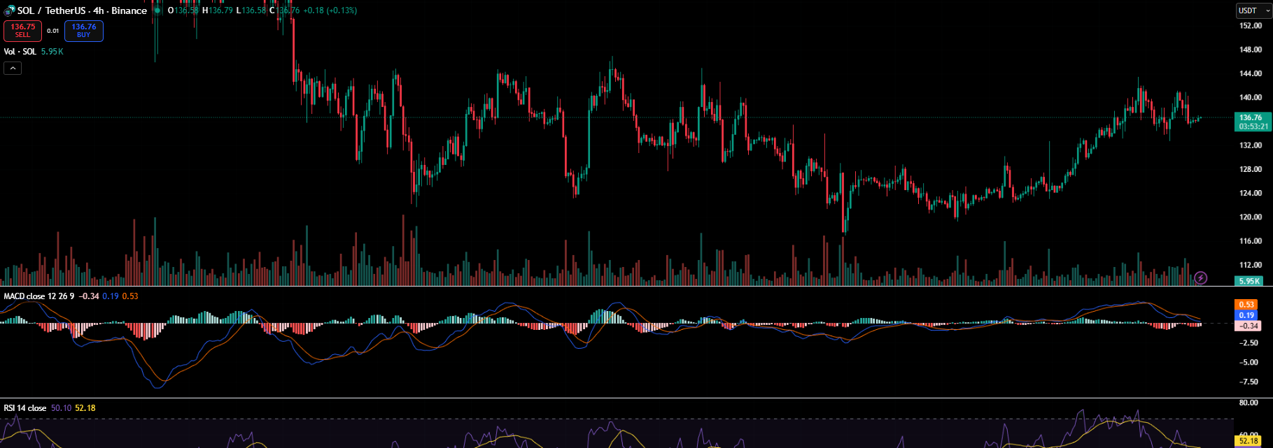 市場の観点から見ると、Solanaの価格動向はストレスよりも安定の期間を反映しています。4時間足チャートでは、SOLは広範なレンジで取引されており、最近は12月の安値付近から回復し、$130s 付近で安定しています。構造は過去数週間にわたり高値の底上げを示しており、積極的な売りよりも徐々に蓄積されていることを示唆しています。