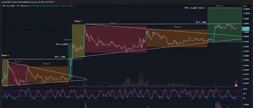 次のフェーズ3は、XRPの長期的な統合期間を示しました。最終的に、XRPの価格は対称三角形の上限を突破し、フェーズ4に入りました。この最終段階で、XRPはTP2に急騰し、6.618フィボナッチ拡張レベルで2回目のATHに到達しました。
