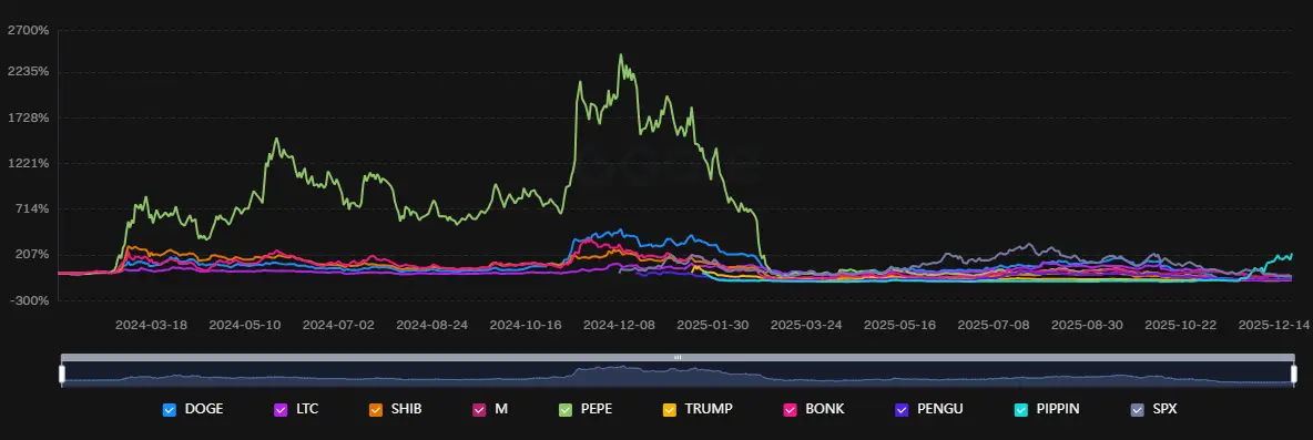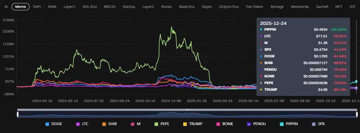 Long-term performance data for the Meme token sector highlights a highly consistent pattern: this asset class is fundamentally cyclical and almost entirely driven by speculative capital flows and market sentiment, rather than any form of sustainable fundamentals or structural growth. Following the explosive rally in the first half of 2024, the majority of Meme tokens have entered a prolonged drawdown phase, with deeply negative performance and an inability to reclaim previous price levels.