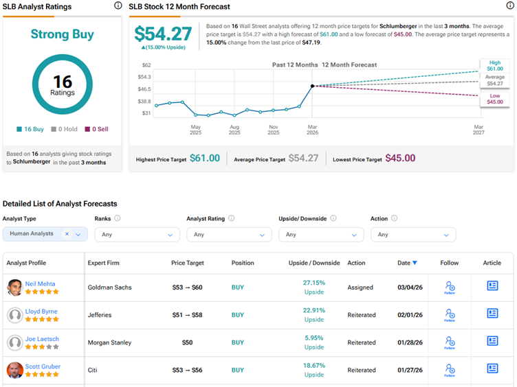 SLB recently announced a 3.5% increase to its quarterly dividend to $0.295. It offers a forward dividend yield of about 2.5%. Currently, Wall Street has a Strong Buy consensus rating on SLB stock based on 16 unanimous Buys. The average SLB stock price target of $54.27 indicates 15% upside potential from current levels.