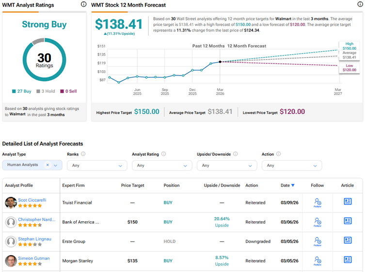 Walmart is seen as a defensive stock and is often favored during periods of economic uncertainty, including potential stagflation, due to the company’s low-price business model and the essential nature of many consumer staple products it sells. Currently, Wall Street has a Strong Buy consensus rating on Walmart stock based on 27 Buys and three Hold recommendations.