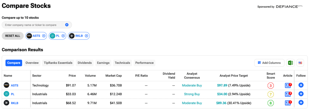 Analysts are closely monitoring public-space companies like RocketLab (RKLB), AST SpaceMobile (ASTS), and Planet Labs (PL). These stocks have gained attention amid increased investor interest in the space industry, with analyst ratings on TipRanks recommending RKLB and ASTS as ‘Moderate Buy,’ while PL is rated a ‘Strong Buy.’ For more information on these space stocks’ performance data, price targets, and analysts’ sentiments, visit TipRanks’ Stocks Comparison Center.