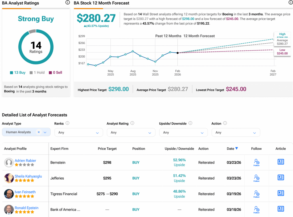 Turning to Wall Street, analysts have a Strong Buy consensus rating on BA stock based on 13 Buys and one Hold assigned in the past three months, as indicated by the graphic below. After a 11.45% rally in its share price over the past year, the average BA price target of $280.27 per share implies 43.57% upside potential.