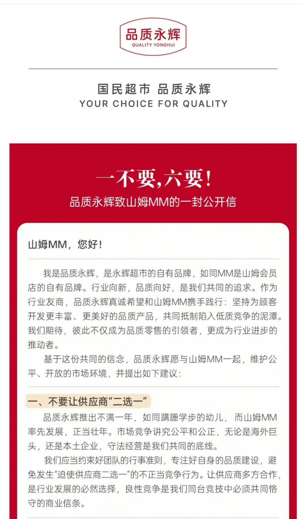 On the afternoon of March 16, Yonghui Supermarket publicly called out Sam through its own brand official account “Quality Yonghui,” urging them not to make suppliers choose between options. This statement quickly trended online.