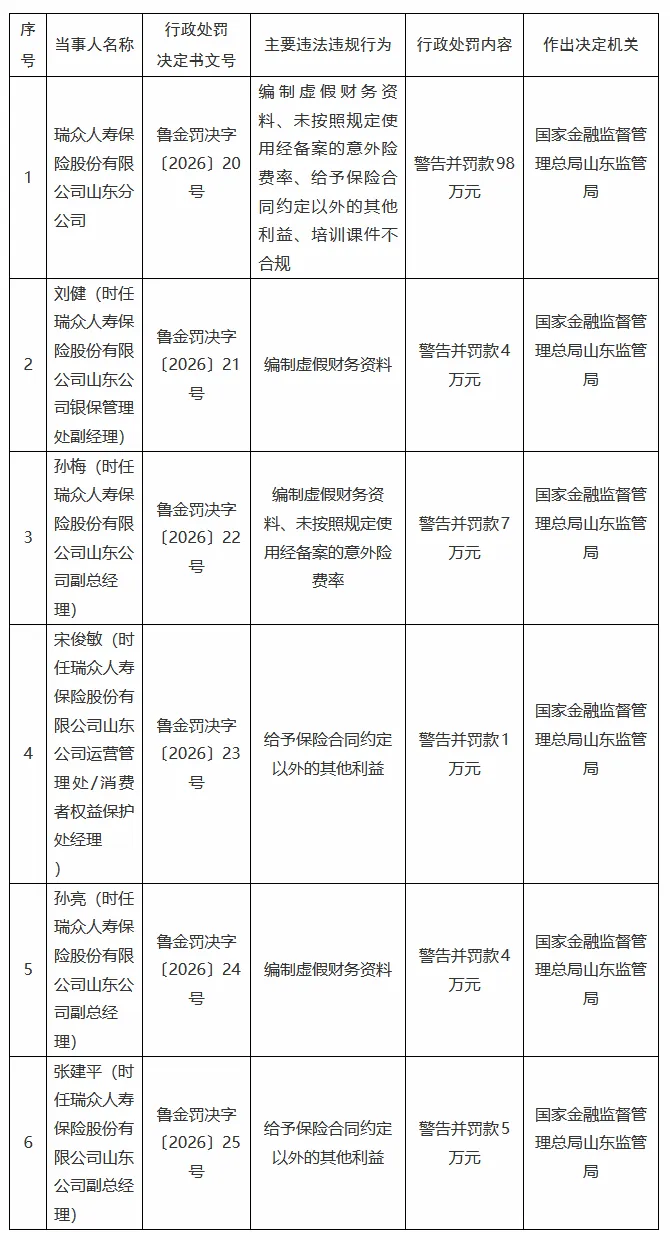 For multiple violations including fabricating false financial documents, Ruizhong Life Shandong Branch was fined 980,000 yuan.