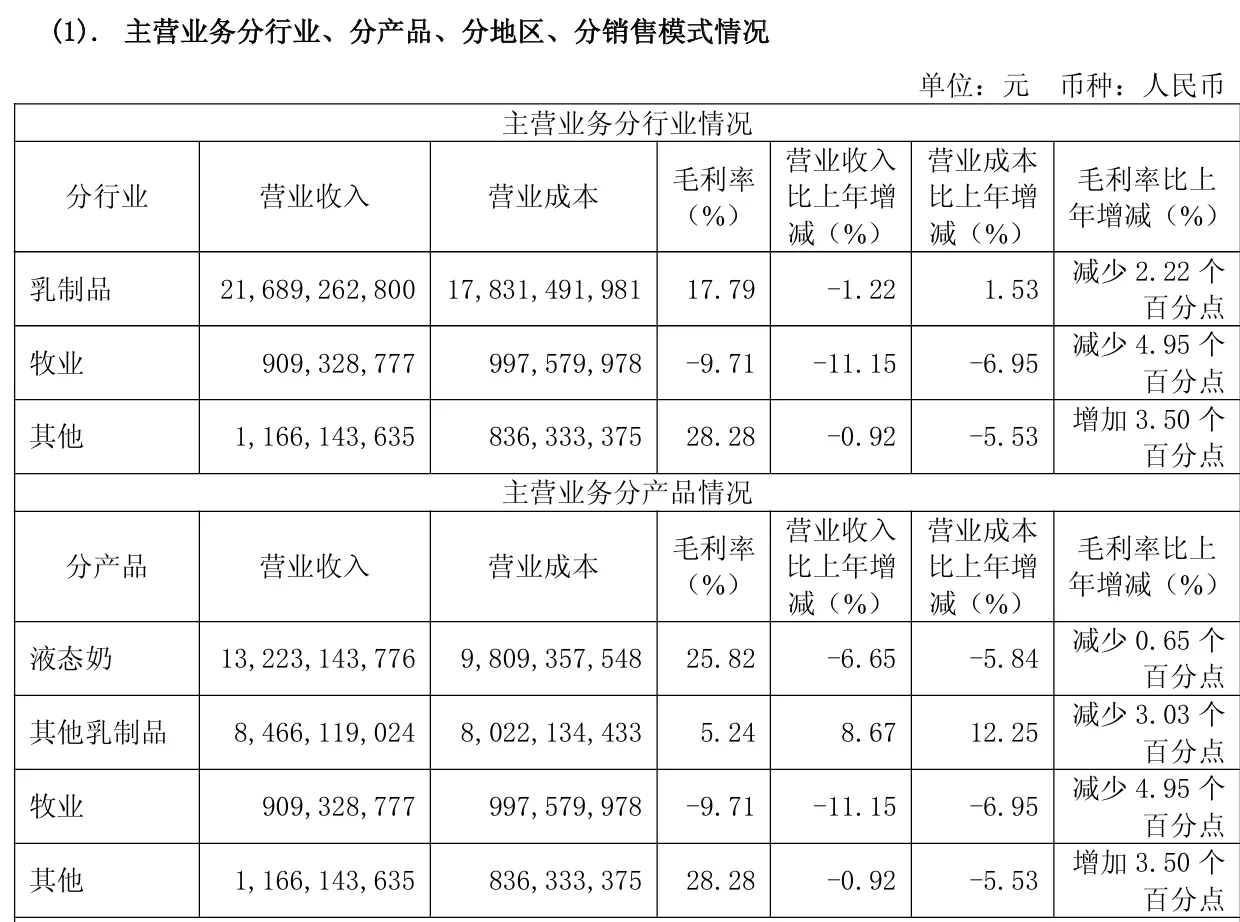 By product segment, the company’s liquid milk achieved operating revenue of 13.223 billion yuan, down 6.65% year over year; operating costs were 9.809 billion yuan, down 5.84% year over year; gross margin was 25.82%, down 0.65 percentage points year over year.