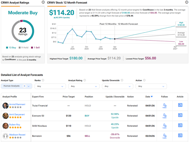 Currently, Wall Street has a Moderate Buy consensus rating on CoreWeave stock based on 13 Buys, nine Holds, and one Sell recommendation. The average CRWV stock price target of $114.20 indicates 45.6% upside potential.