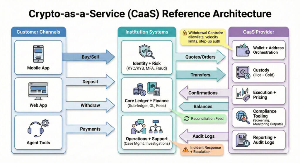 A CaaS model keeps customer experience and governance inside the institution while outsourcing wallet orchestration, custody options, and execution rails to a specialist provider.