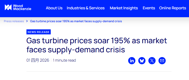 According to a recent report by consulting firm Wood Mackenzie, the gas turbine market is facing a severe imbalance driven by rising electrification demand—especially the expansion of data centers—which will cause product prices to keep soaring through 2027.