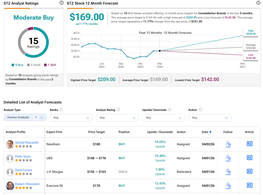 Turning to Wall Street, Constellation Brands has a Moderate Buy consensus rating based on nine Buys, five Holds, and one Sell assigned in the last three months. At $169.00, the average STZ price target implies 11.77% upside potential.