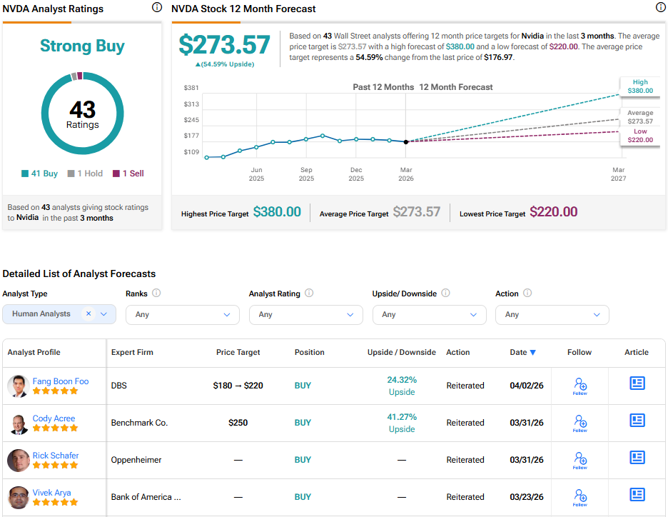 Turning to Wall Street, analysts have a Strong Buy consensus rating on Nvidia stock based on 41 Buys, one Hold, and one Sell assigned in the past three months, as indicated by the graphic below. Furthermore, the average Nvidia price target of $273.57 per share implies 54.6% upside potential.