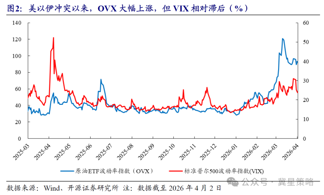 To effectively observe volatility, we introduce two volatility indicators: OVX and VIX. OVX, the crude oil ETF volatility index, measures market expectations for crude oil volatility over the next month and represents energy supply risk; VIX, the Chicago Options Exchange volatility index—commonly known as the fear index—measures market expectations for S&P 500 volatility over the next month and represents recession risk. If we are concerned about whether the market’s worry about energy supply risk will transmit to the economy, leading to system-wide risks such as the economy, we can assess and capture this by looking at the trends of OVX and VIX.