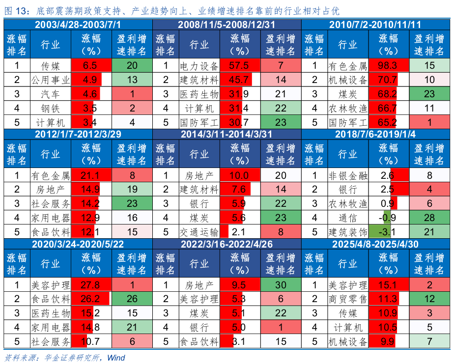 During the bottoming-out consolidation period, leading technology and cyclical sectors may have a relative advantage. (1) Looking back at history, during bottoming-out consolidation periods, industries with policy support, an upward industrial trend, and top earnings-growth rankings tend to be relatively advantaged. First, industries with policy support during bottoming-out consolidation periods have a relative advantage—for example, from 2008/11/5 to 2008/12/31, power equipment, building materials, real estate, and other sectors that benefited from the Four Trillion policy stimulus and drove infrastructure investment demand had a relative advantage; from 2020/3/24 to 2020/5/22, consumer staples and beauty & personal care sectors had a relative advantage due to the “Implementation Opinions on Expanding and Upgrading Consumption and Accelerating the Formation of a Strong Domestic Market” and consumption voucher issuance in many places nationwide. Second, industries with upward industrial trends have a relative advantage—for example, from 2003/4/28 to 2003/7/1, media benefited from the outbreak of the SARS epidemic causing a surge in entertainment demand; with industrial trends like internet media moving upward, they were relatively advantaged. Third, industries with leading earnings-growth rankings have a relative advantage—for example, from 2003/4/28 to 2003/7/1, auto, and steel’s profitability growth rankings were 1st, 2nd, and 4th respectively; their corresponding price-increase rankings were 3rd, 4th, and 5th respectively. For 2020/3/24 to 2020/5/22, beauty and personal care’s earnings growth ranking was 1st, and its corresponding price-increase ranking was 1st. For 2025/4/8 to 2025/4/30, beauty and personal care and media’s earnings growth rankings were 2nd and 3rd respectively, with their corresponding price-increase rankings being 1st and 3rd respectively. (2) Looking at the current situation, in the short term sectors such as electronics, communications, nonferrous metals, power equipment, etc., may have a relative advantage. First, sectors such as power and electrical & power equipment may be supported in the short term by policies—for example, during this year’s two sessions the emphasis was on “power-amount coordination,” including proposing the establishment of a national low-carbon transition fund and supporting green fuels; the “Implementation Opinions on Improving the National Unified Electricity Market System” further deepens the power market reform; and the “Basic Rules for the Electricity Mid- and Long-Term Market” removes fixed time-of-use electricity prices, etc. Second, with AI demand driving the business conditions of AI hardware, the outlook for AI hardware business conditions may continue to rise. Increased prices of related commodities such as petrochemicals, nonferrous metals, and chemical products may also keep cyclical sectors’ business conditions moving upward. Third, based on disclosed 2025 annual report performance, in technology growth sectors, electronics, computers, and electrical equipment have relatively high annual earnings growth rates of 44.5%, 30.9%, and 27.1% respectively; in cyclical sectors, steel, nonferrous metals, and chemical industries have relatively high annual earnings growth rates of 124.5%, 66.1%, and 14.3% respectively.