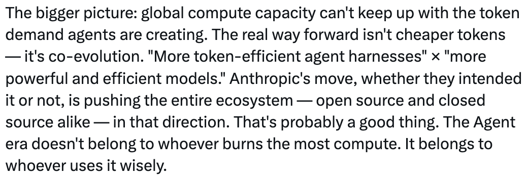 She believes Anthropic’s action is not simply a defensive move in business, but a necessary milestone in the ecosystem’s maturation, given that the global supply of compute can’t keep up with the accelerating demand of Agents.