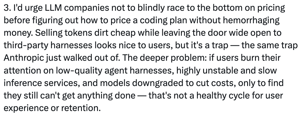She also reminds major language model companies that before they have clarified the programming plan cost structure, they should not blindly jump into pricing races. Selling tokens cheaply both opens the door for third-party frameworks and appears friendly to users on the surface, but in reality it’s a trap—and Anthropic has just stepped out of that trap.