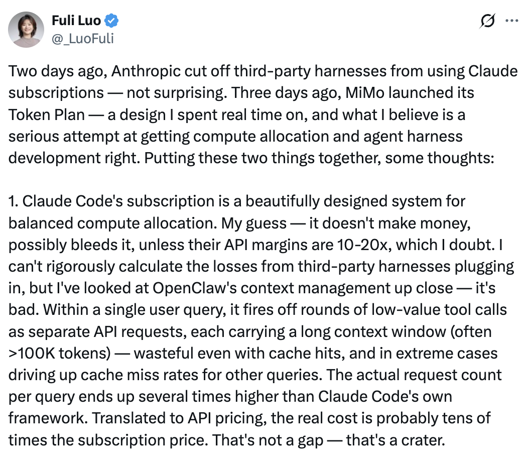 While interpreting Anthropic’s move, Luo also explains the design logic behind the MiMo Token plan.