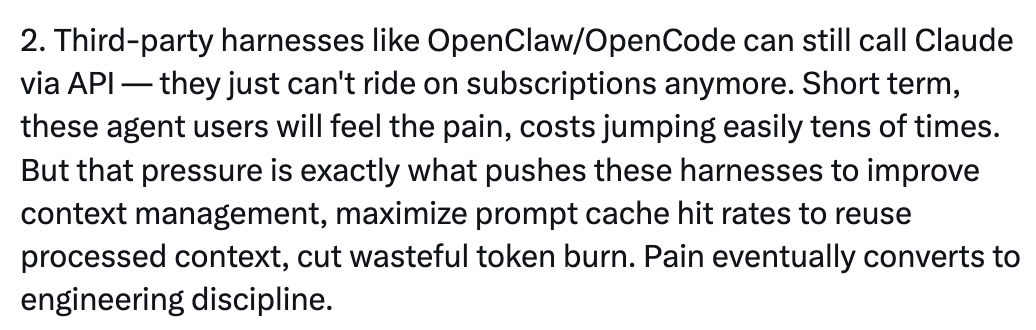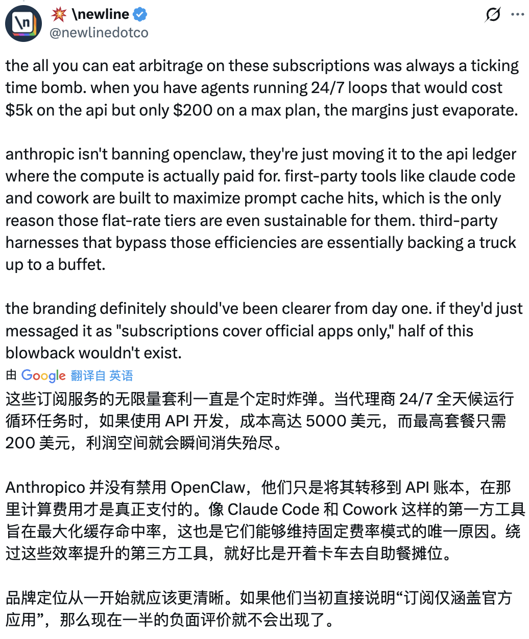 AI Workshop organizer @newlinedotco commented: The subscription “all you can eat” bundle has been a ticking time bomb from the start—third-party harnesses (such as OpenClaw) loop calls 24/7, with API costs that may reach as high as $5,000, while the subscription is only $200. Official tools (such as Claude Code) can remain sustainable only thanks to prompt cache optimization.