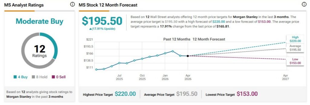 Following the stock’s recent pullback, Morgan Stanley still has a Moderate Buy consensus rating on Wall Street, based on four Buy and eight Hold ratings. Notably, no analyst rates the stock a Sell. In addition, MS’s average price target of $195.50 implies roughly 18% upside potential over the next 12 months.