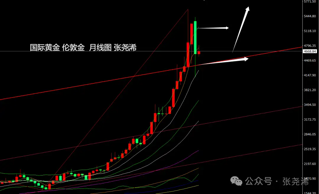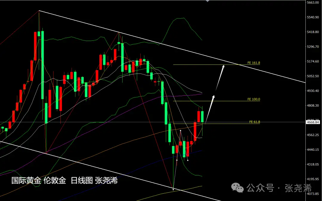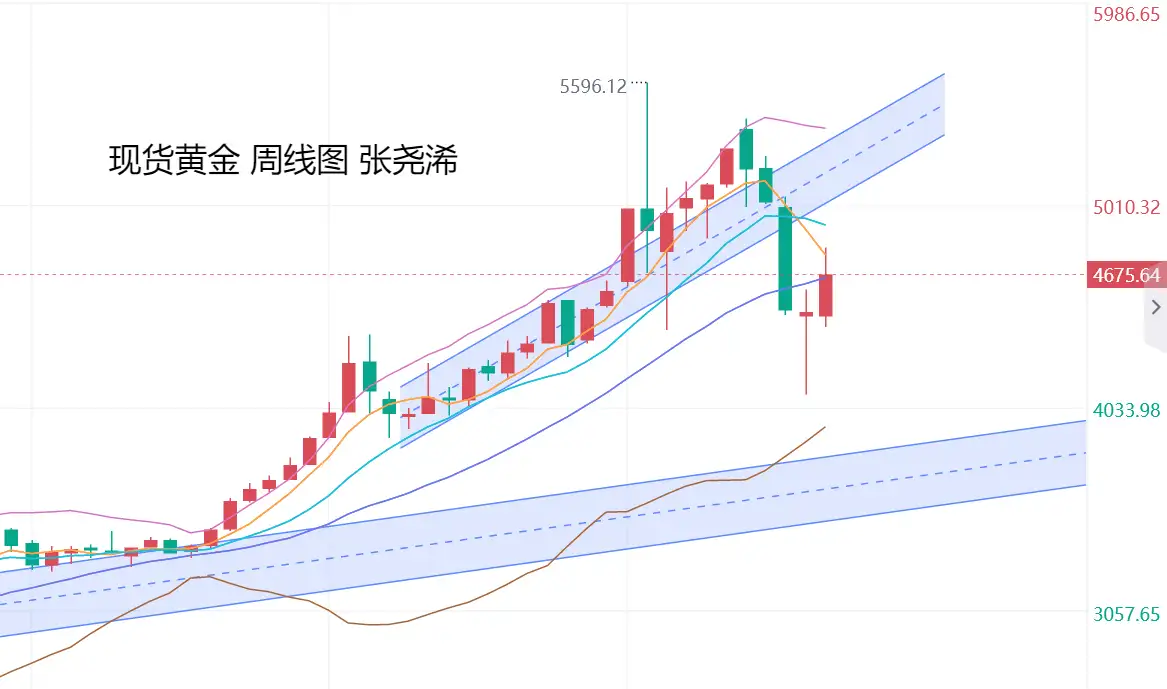 On the weekly chart level, gold this week has, as expected, continued the pattern from last week: bottoming out, rebounding, stopping the fall, and forming a bullish shape with rebound momentum, and it has further strengthened. Although it has not yet broken through the 5- to 10-week moving average resistance and is holding steady to turn stronger, based on the bullish arrangement of the long-term moving averages below and whether the ZZ indicator is still not showing a top for the current rebound, the direction still remains bullish. Key resistance to watch is the 10-week moving average pressure. If it breaks through this level, it may again refresh highs.