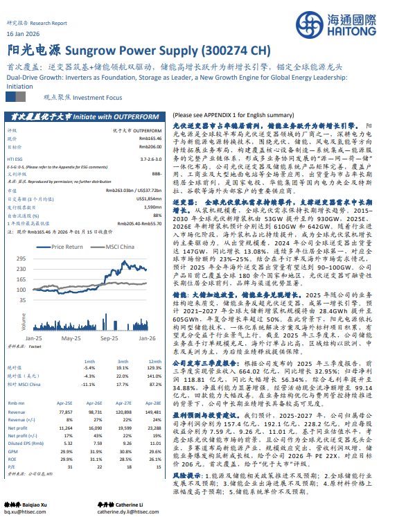 In January 2026, Haitong International published a research report on Sunshine Power titled: 《Initiation of Coverage: Inverters as the Foundation + Energy Storage Leading the Dual-Drive; Energy Storage’s High Growth Jumps to a New Growth Engine, Anchored to a Global Energy Leader》.