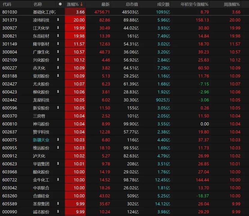 The basic chemicals sector was especially impressive. A total of 33 stocks hit the daily limit. Lingwei Technology, Jiangtian Chemical, and Dongyue Silicones all secured “20cm” daily limit-ups. Xinghua Co., Ltd. (002109), Chitianhua, Yabang Co., Ltd., Youfu Co., Ltd., Liuzha Chemical, Longxing Technology, Xinan Co., Ltd. (600596), Sanfangxiang (600370), Shenma Co., Ltd. (600810), Zanyu Technology (002637), Xinjiang Tiansye (600075), Weiyuan Co., Ltd., and others all hit the daily limit.