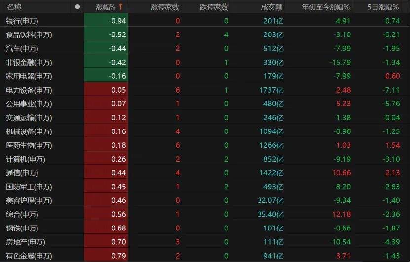 Among 31 Shenwan primary industries, banks, food and beverage, automobiles, non-bank financials, and household appliances all closed lower, but the overall declines did not exceed 1%.