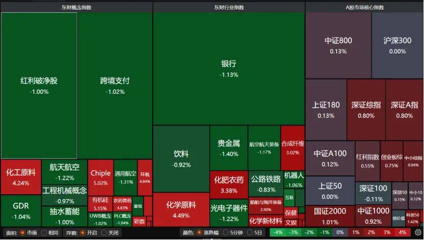 On the trading board, sectors such as banks, precious metals, beverages, aerospace, optical-electronic devices, and robots (300024), as well as dividend/undervalued stocks generally adjusted. By contrast, fertilizer/pesticide, chemical raw materials, and the Chiplet (advanced packaging) concept sectors led strongly.