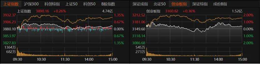 The first trading day after the Qingming small holiday saw mixed market performance. The good news is that the stock index closed green; the bad news is that trading volume shrank. A-share indexes overall stabilized in a range and closed higher. During the session, they briefly dipped into red but ultimately edged up slightly at the close. The Shanghai Composite Index rose 0.26% to 3,890.16 points; the ChiNext Index rose 0.36% to 3,160.82 points; and the Shenzhen Component Index also rose 0.36%. The CSI 300 and SSE 50 closed flat. The STAR Market 50 rose 1.42%, while the Beijing Stock Exchange 50 fell 0.34%.