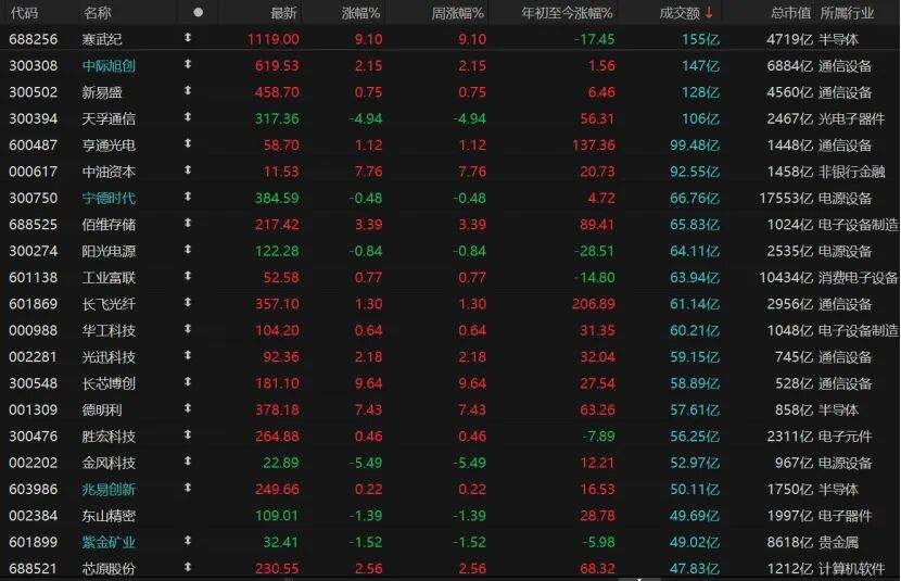 Overall, more stocks rose than fell. A total of 3,977 stocks closed higher, with 101 stocks hitting the daily limit. Meanwhile, 1,426 stocks closed lower, with 18 stocks hitting the daily limit. Cangwu Ji’s daily trading value was 15.5 billion yuan. It rose 9.1% and closed at 1119 yuan per share. Meanwhile, Jichuang Xuanchuang (300308) and Xin Yisheng (300502) also closed higher. Tianfu Communication (300394) adjusted significantly, with a decline of nearly 5%.